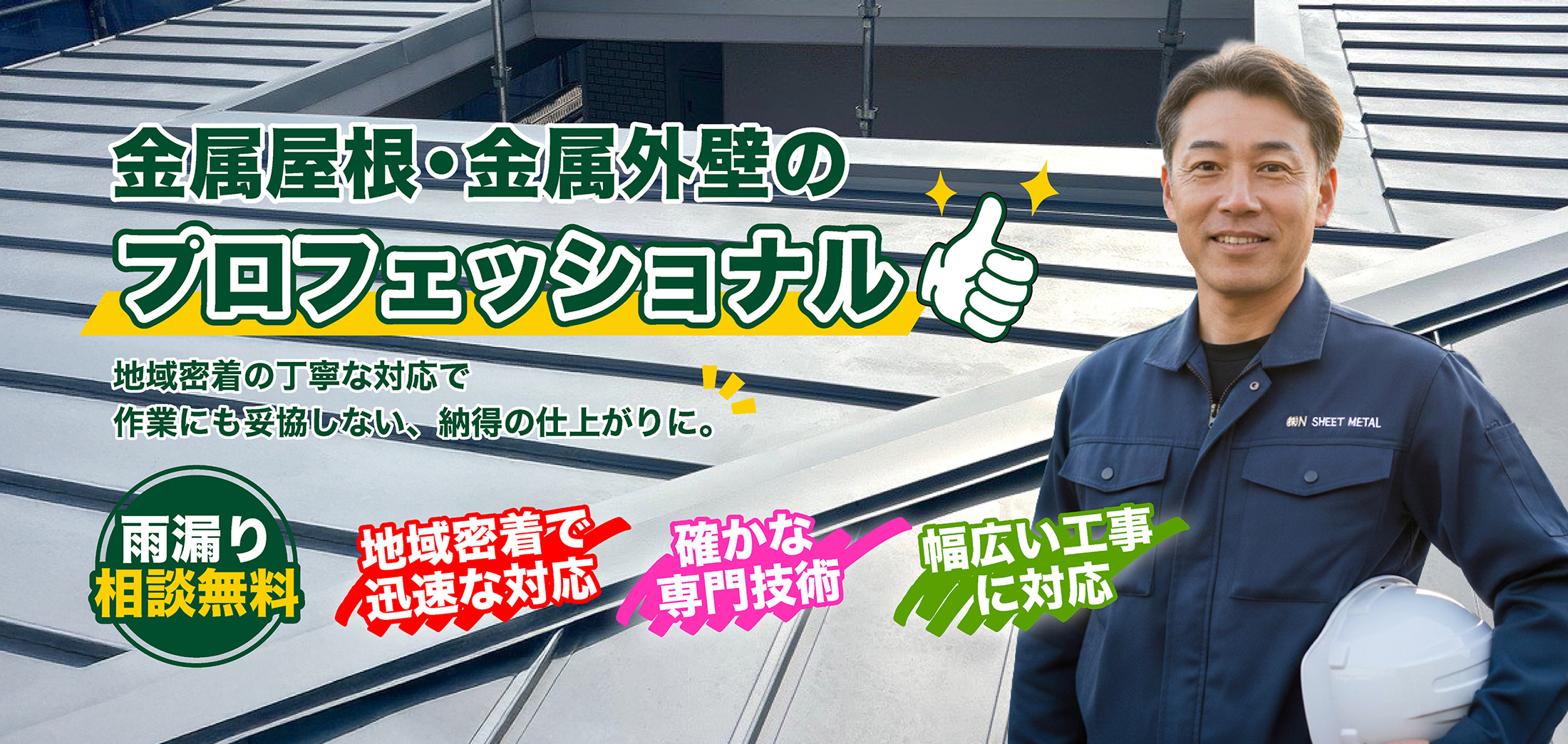 N SHEET METALは、兵庫県神戸市を中心に、屋根工事・板金工事・雨樋工事・外壁工事・雨漏り修理など、住まいの外回りに関わる工事を幅広く行っています。